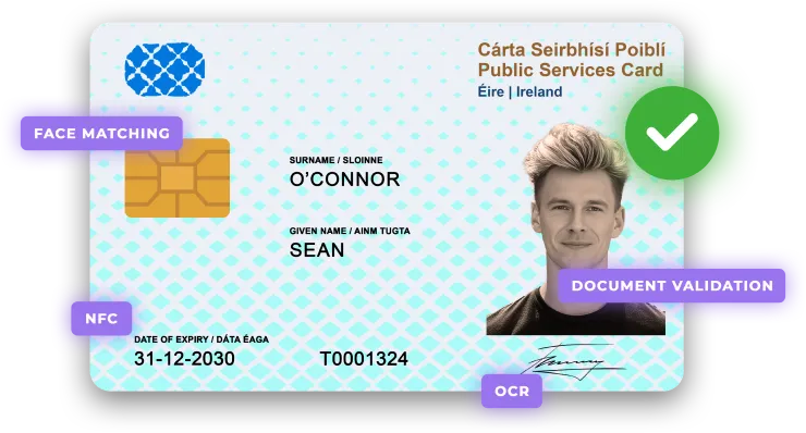Idenfo can verify the Irish Public Services Card, issued by the Department of Social Protection, ensuring accurate data matching and full compliance with Irish regulatory requirements.