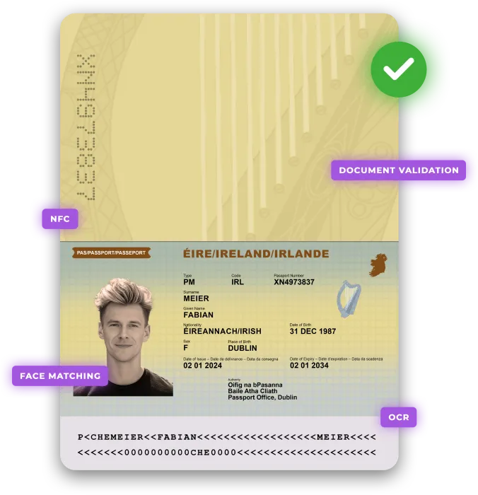 Idenfo verifies Irish passports issued by the Department of Foreign Affairs, confirming the holder’s name, date of birth, and contact details as part of Enhanced Due Diligence for KYC in Ireland.