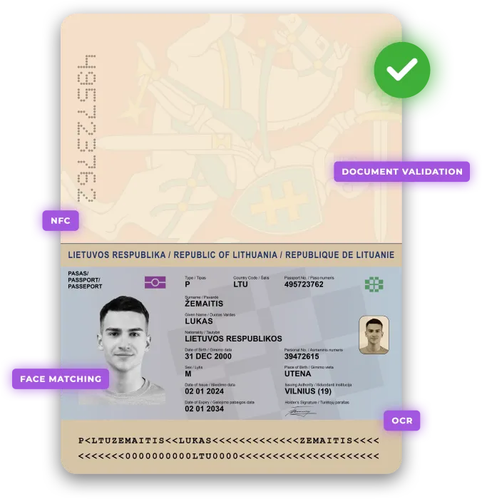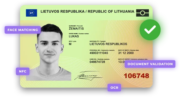 Idenfo can verify the Lithuanian ID card, issued by the Lithuanian Migration Department, ensuring precise data matching and full compliance with Lithuanian regulatory requirements and identity verification standards.