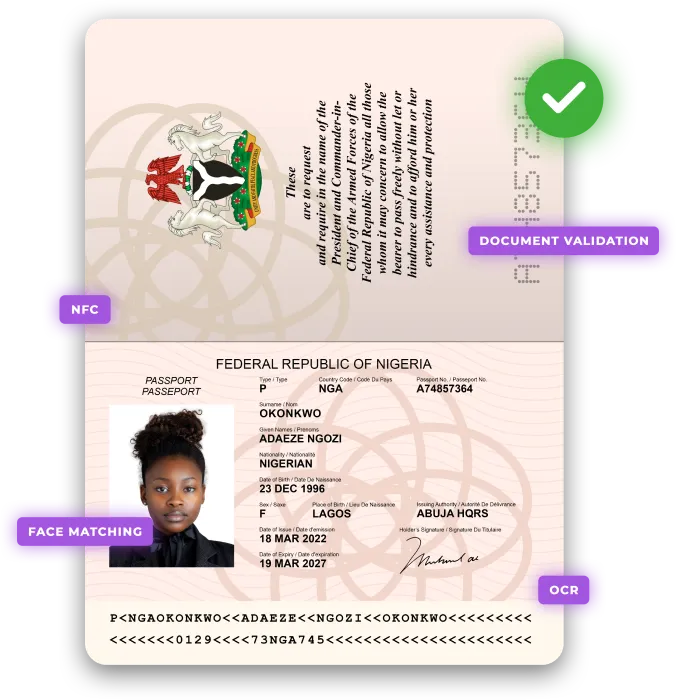 Idenfo verifies Nigerian passports issued by the Nigeria Immigration Service (NIS), confirming the holder’s name, date of birth, and contact details as part of Enhanced Due Diligence for KYC in Nigeria.