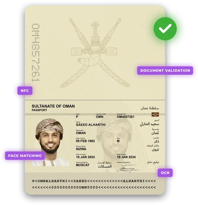 Idenfo can verify the Omani National ID, issued by the Royal Oman Police, ensuring accurate data matching and full compliance with Omani regulatory requirements.