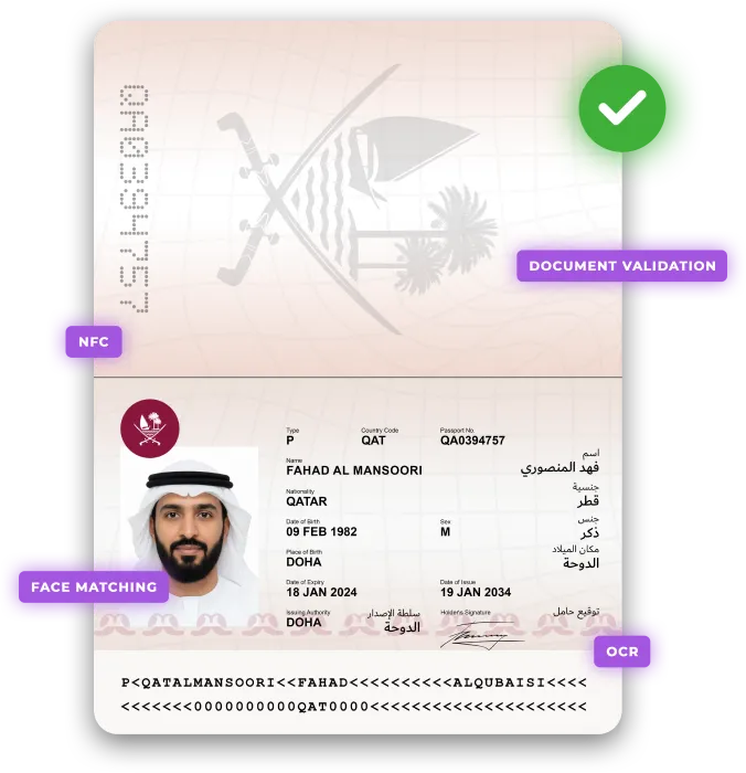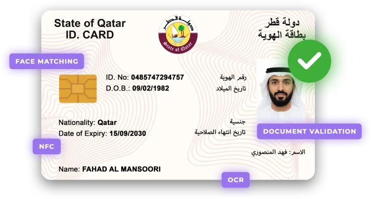 Idenfo can verify the Qatari ID, the national identity card issued by the Ministry of Interior, ensuring precise data matching and full compliance with Qatari regulatory requirements.