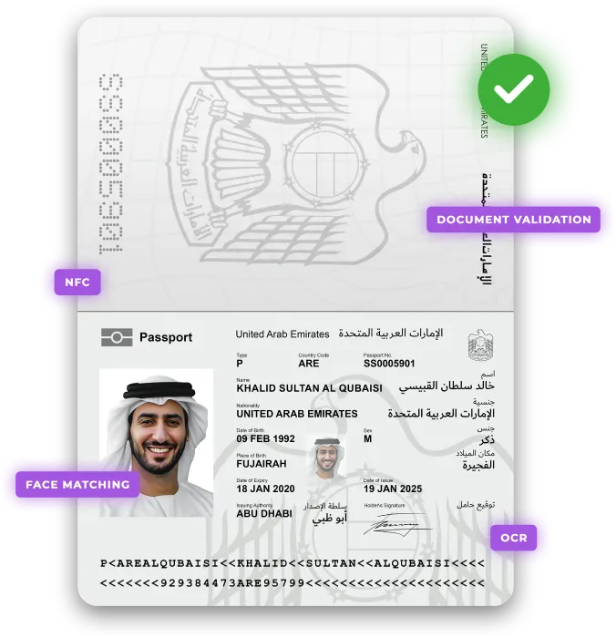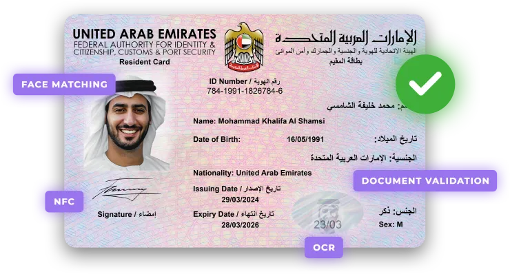 Idenfo can verifiy the Emirates ID, the national identity card issued by the Federal Authority for Identity, Citizenship, Customs and Port Security, ensuring precise data matching and full compliance with UAE regulatory requirements.
