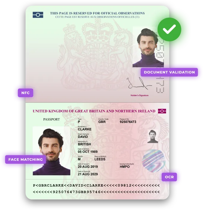 Idenfo verifies British passports issued by HM Passport Office, confirming the holder’s name, date of birth, and contact details as part of Enhanced Due Diligence for KYC in the UK.