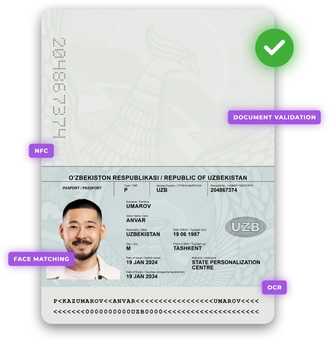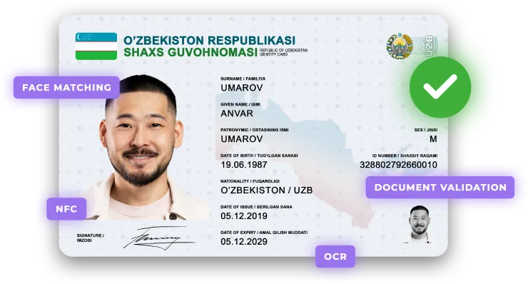Idenfo can verify the Uzbekistani National ID, issued by the Ministry of Justice, ensuring accurate data matching and full compliance with Uzbekistani regulatory requirements.